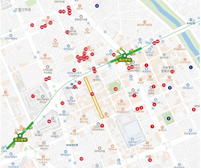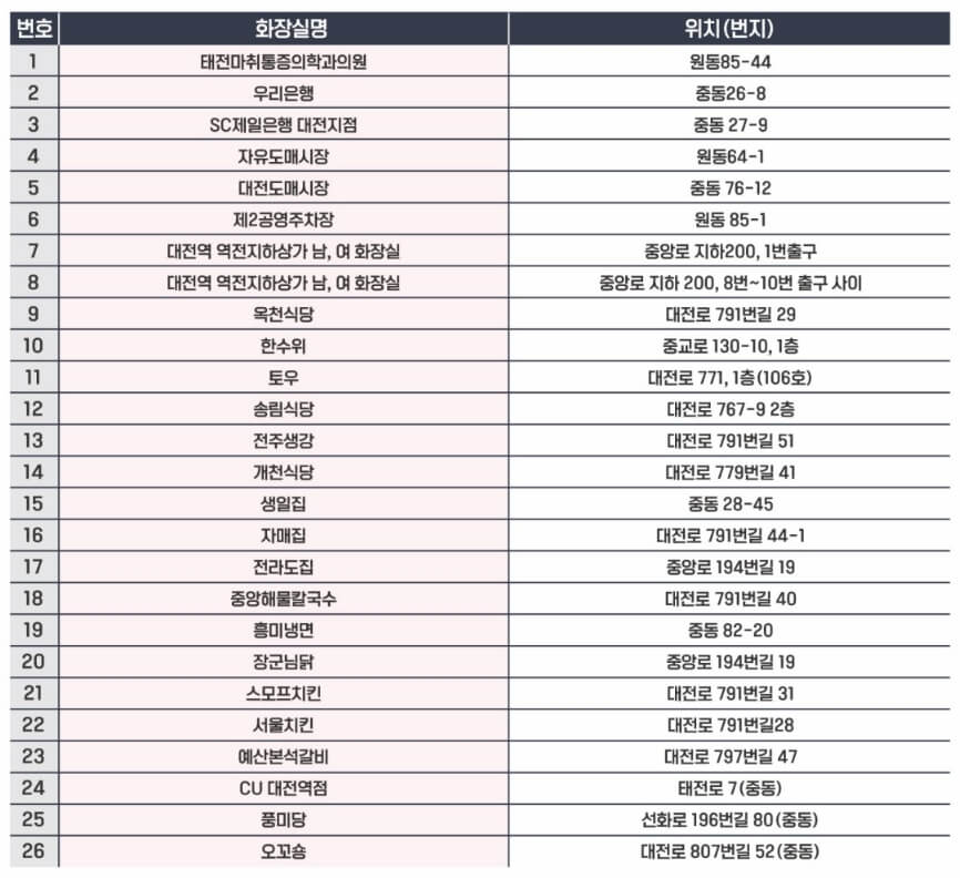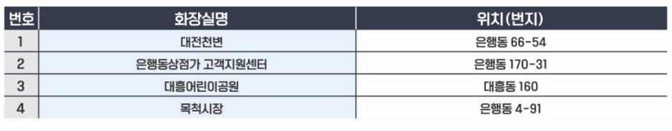 2024 대전 0시 축제가 진행되는 동안 급하게 이용할 수 있는 공중 화장실과 개방 화장실 위치와 화장실 명을 확인하실 수 있습니다. 아래로 쭉 내리시면 화장실 명과 위치를 확인하실 수 있습니다.
