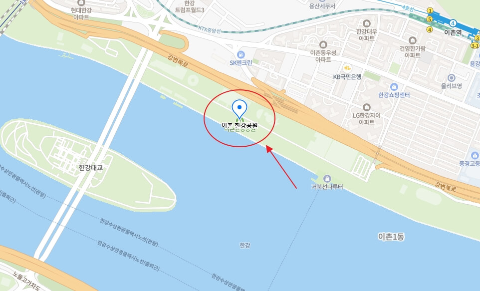 개인적으로는 원효대교 우측에 자리 잡는 것을 추천합니다.