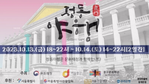 올해 2023 초가을을 빛낼 정동야행은 10/13(금) 오후 2시부터 밤 10시 까지, 14일(토) 오후 6시부터 밤 10시까지 행사가 진행됩니다. 정동일대의 문화 시설 20곳이 야간 개방을 하게 되며 다양한 공연과 전시가 진행될 예정입니다.