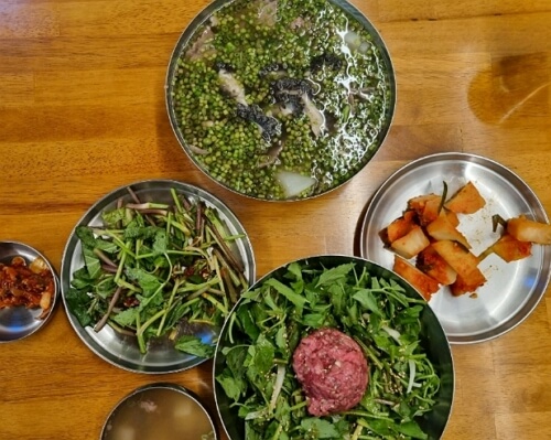 이곳의 시그니처 메뉴는 육회 비빔밥, 미나리곰탕, 미나리 수육전골이라고 할 수 있습니다.